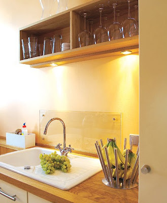 Също толкова практично е решението относно стената зад мивката. За да се предотвратят мокрите пръски по нея е използвана стъклена плоскост, която е лесна за поддръжка, а освен това не заема никакво място. По този начин са избегнати скъпоструващите облицовки от плочки, ламинирани повърхности, корк и т.н.